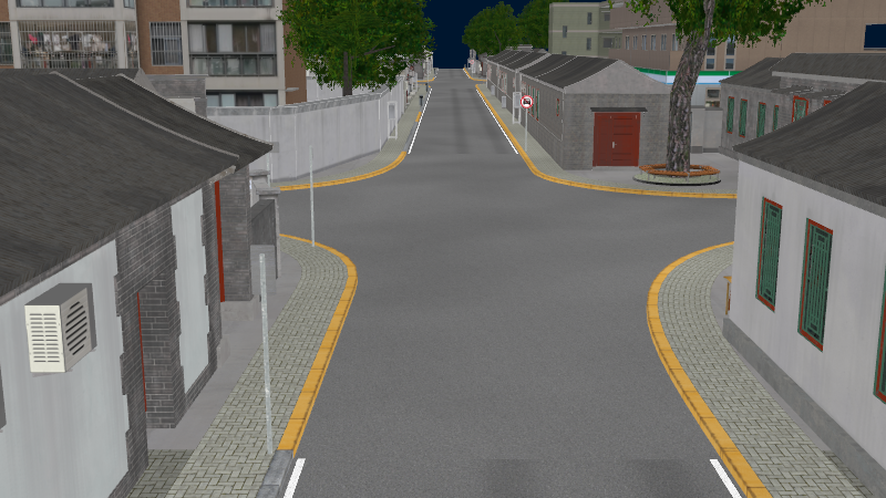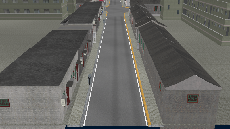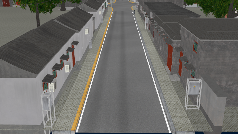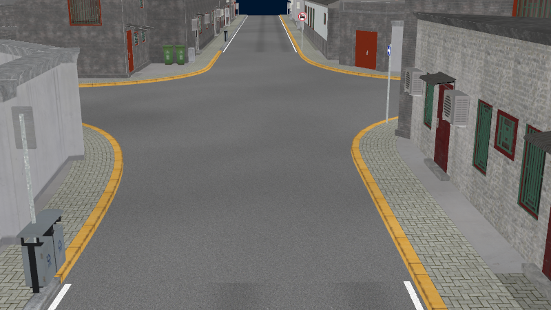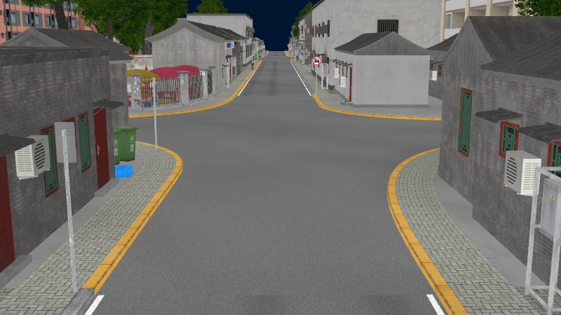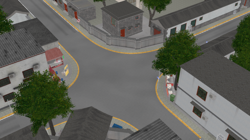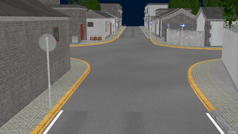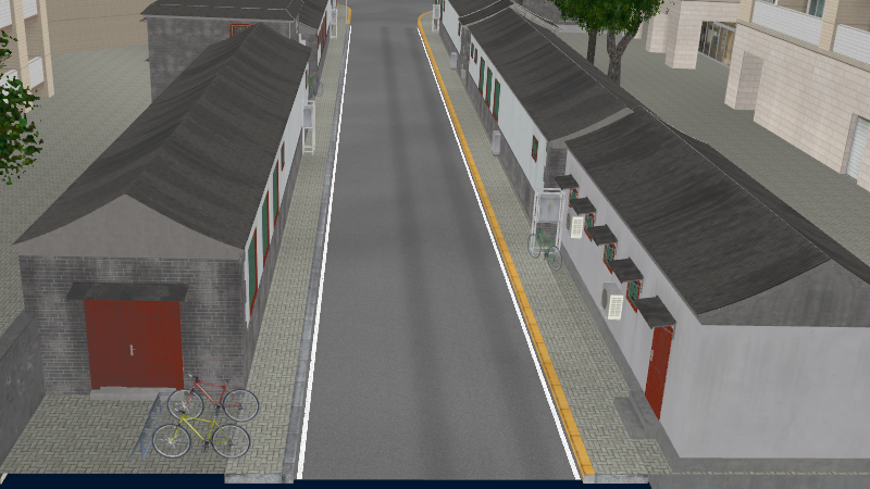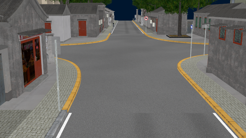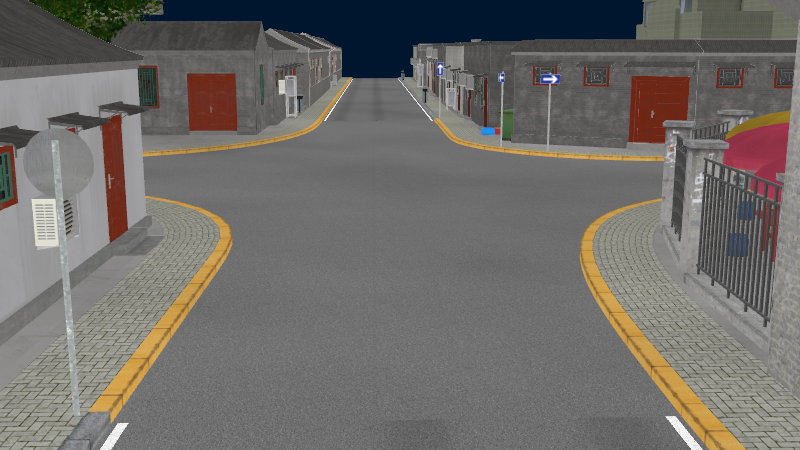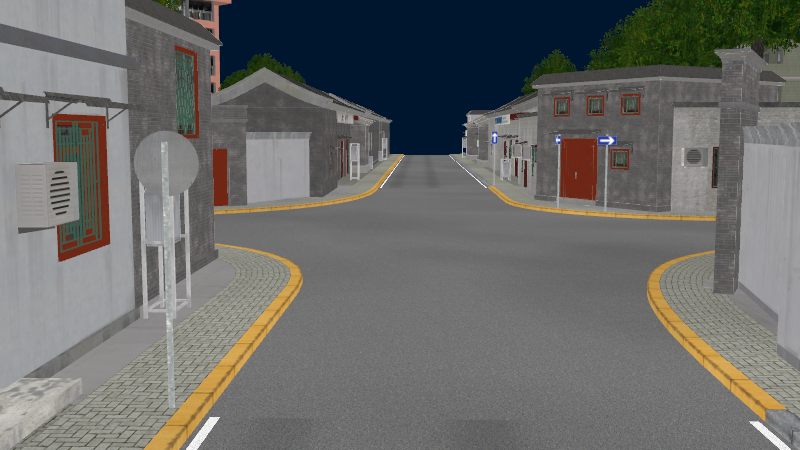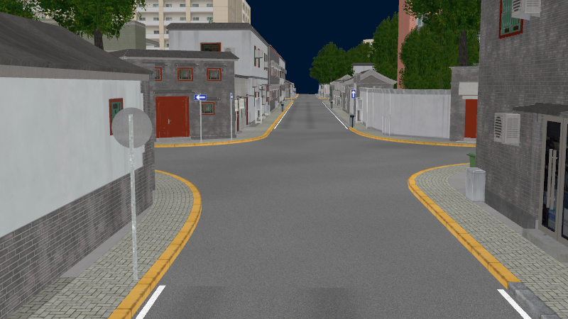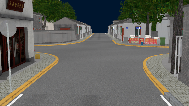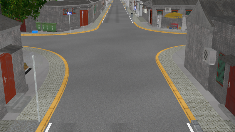 HuTong style environment with one-way roads with parking-lanes on right-hand side, yellow curbstones near driving-lanes indicating no-parking. In the intersections signs show the driving directions for cars.