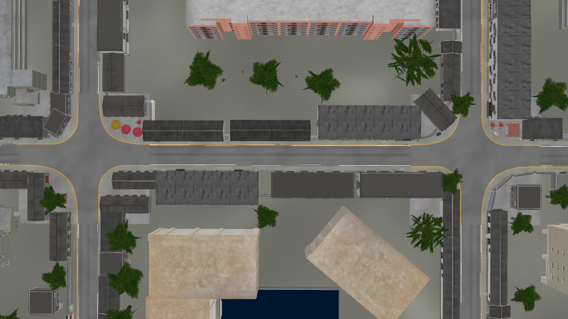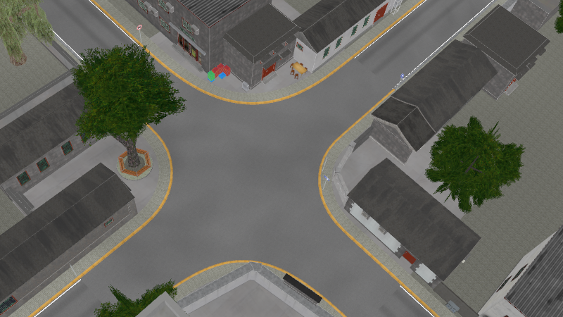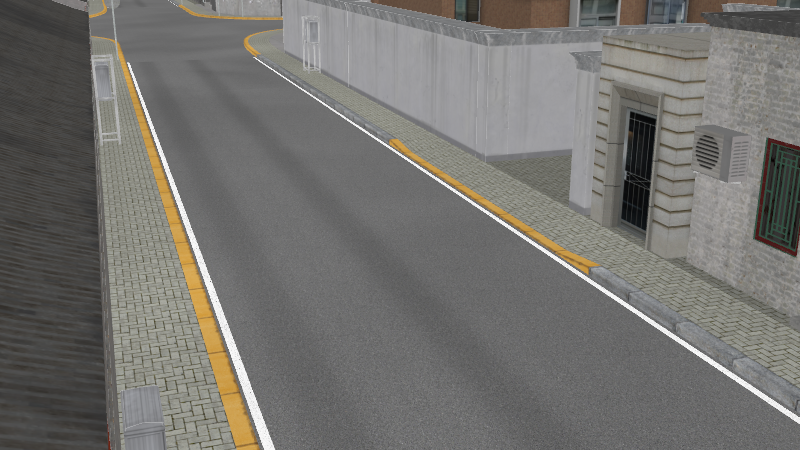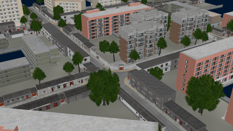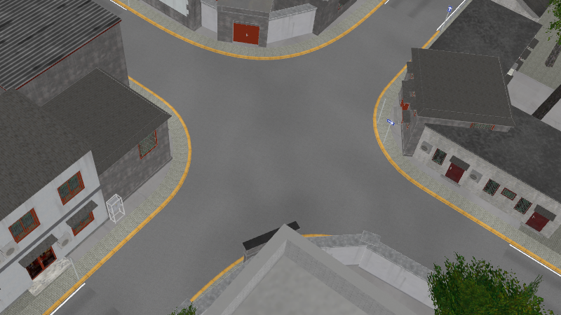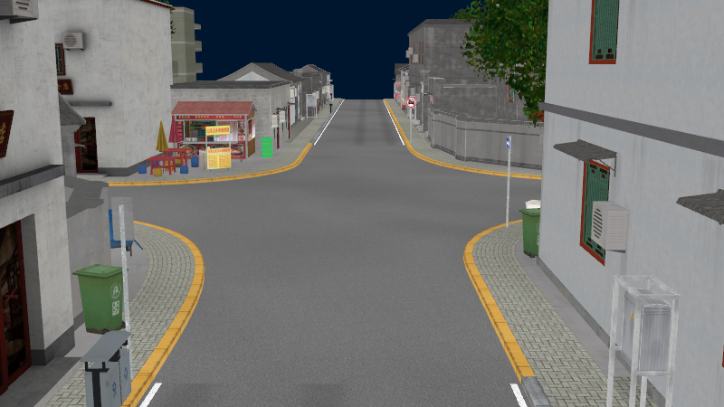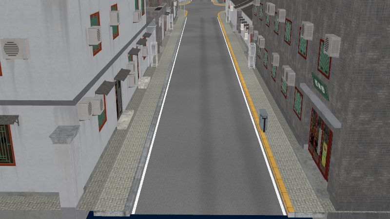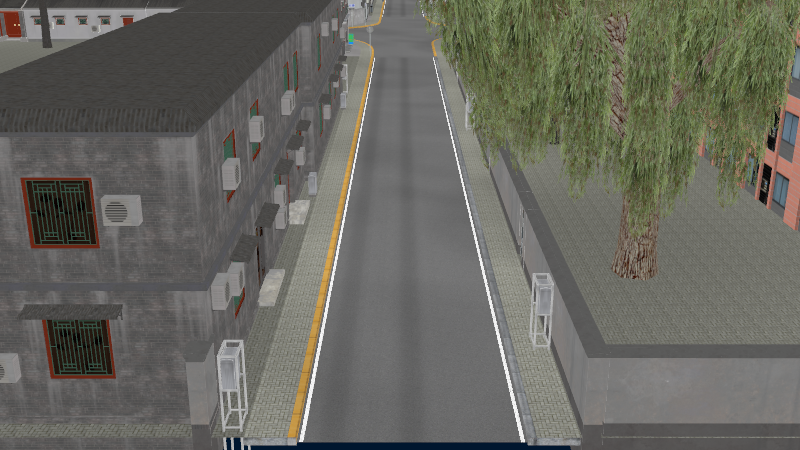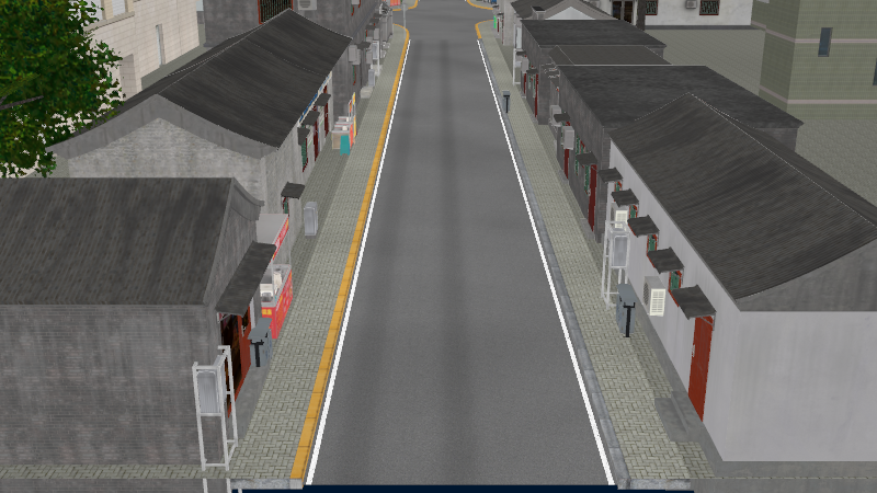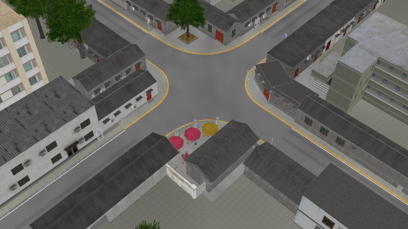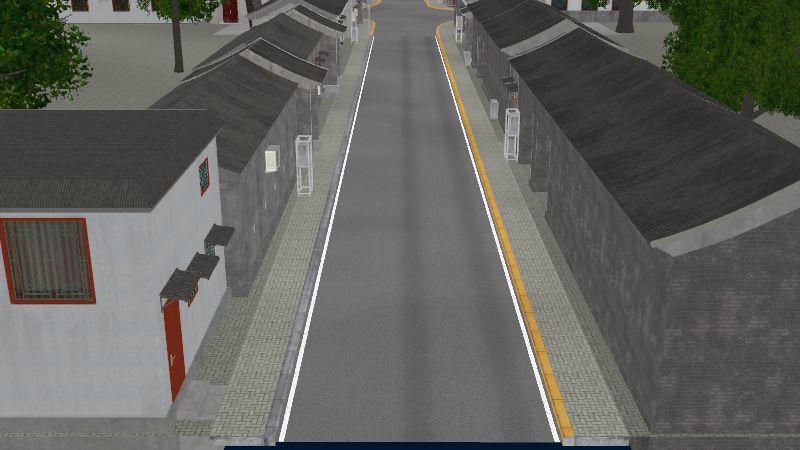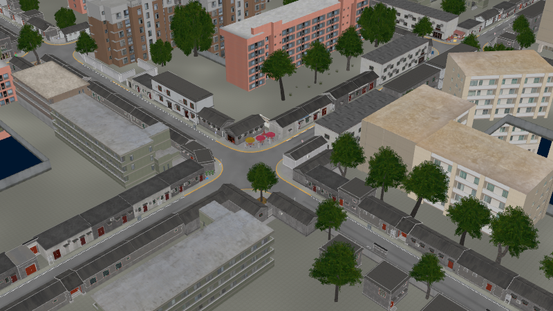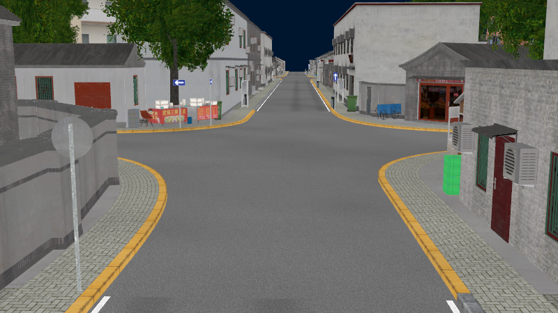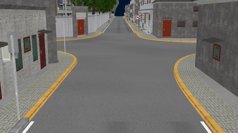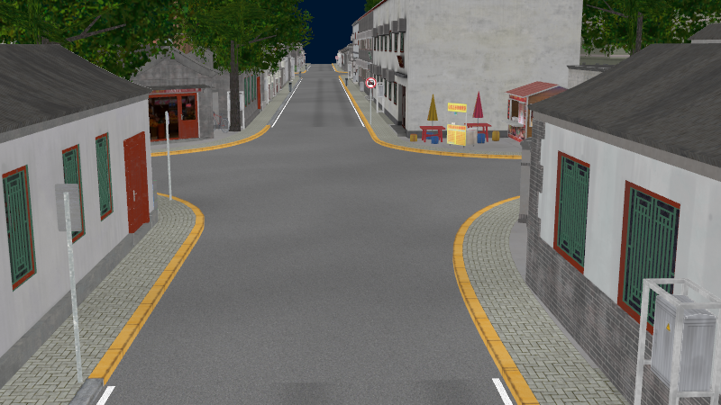 HuTong style environment with one-way roads with parking-lanes on right-hand side, yellow curbstones near driving-lanes indicating no-parking. In the intersections signs show the driving directions for cars.