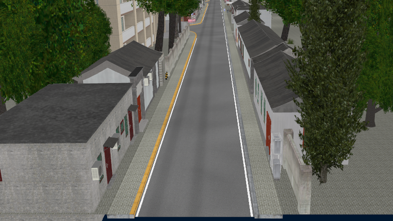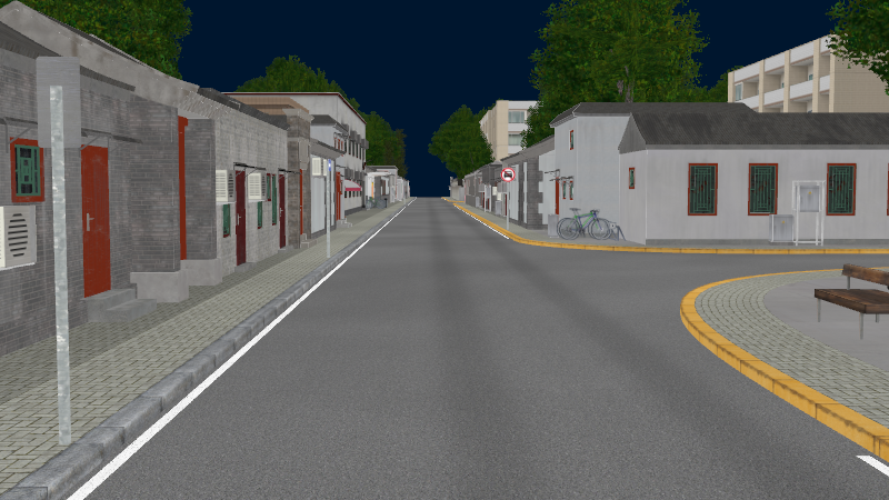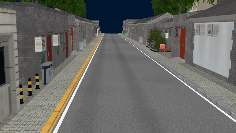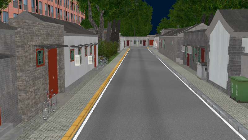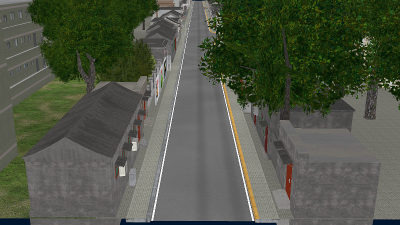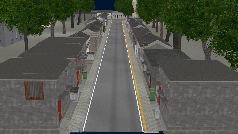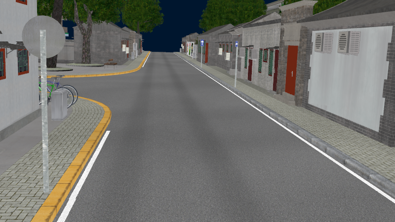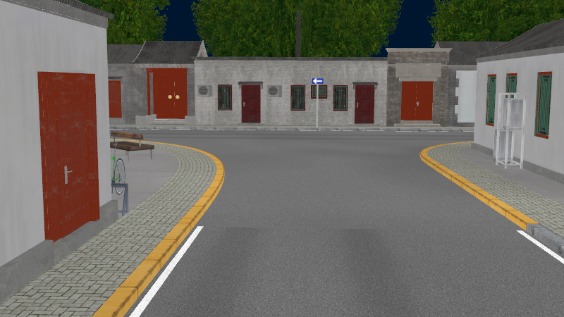 HuTong style environment with one-way roads with parking-lanes on right-hand side, yellow curbstones near driving-lanes indicating no-parking. In the intersections signs show the driving directions for cars.