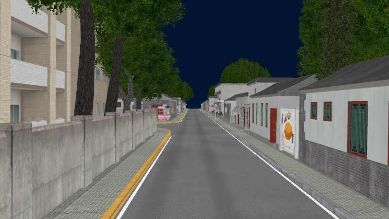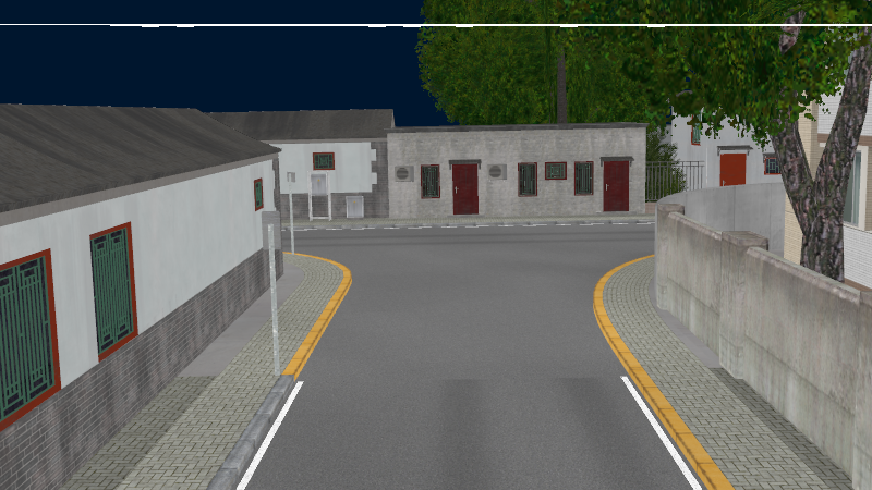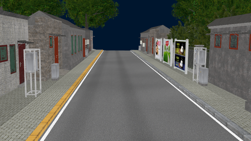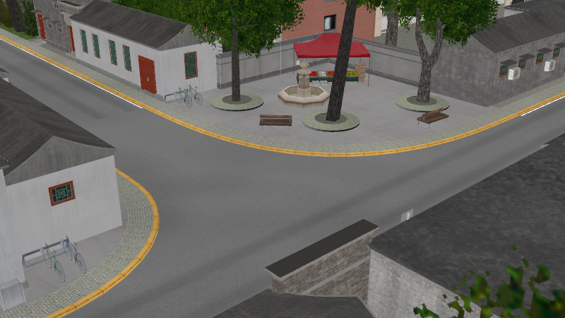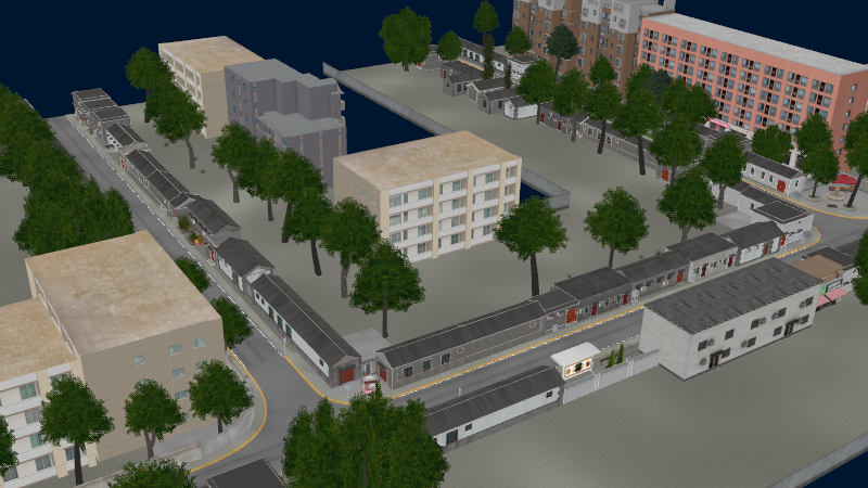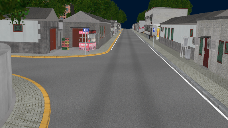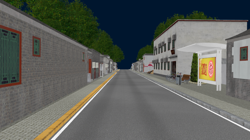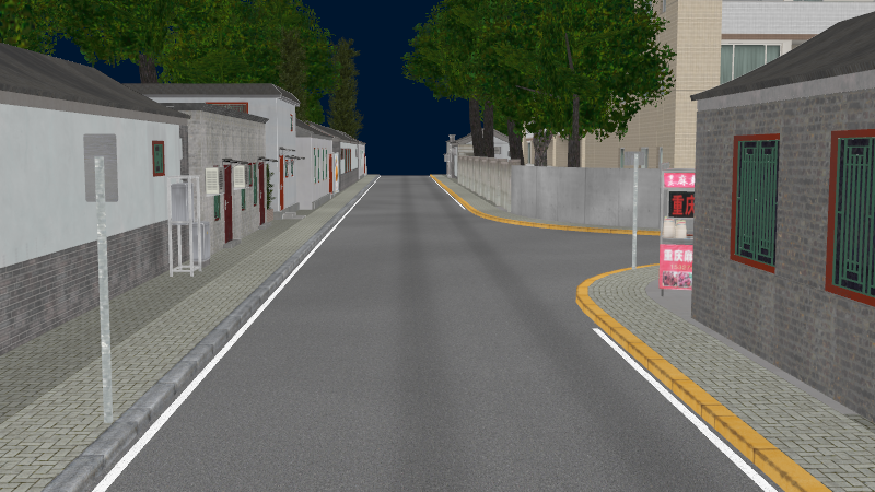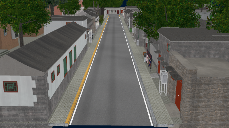 HuTong style environment with one-way roads with parking-lanes on right-hand side, yellow curbstones near driving-lanes indicating no-parking. In the intersections signs show the driving directions for cars.