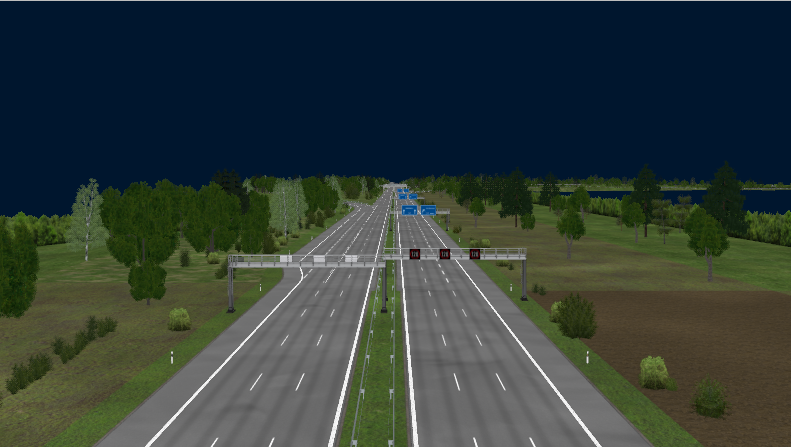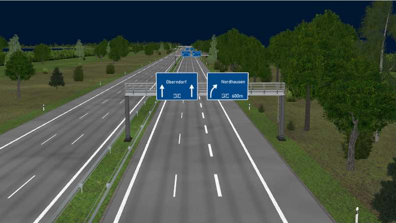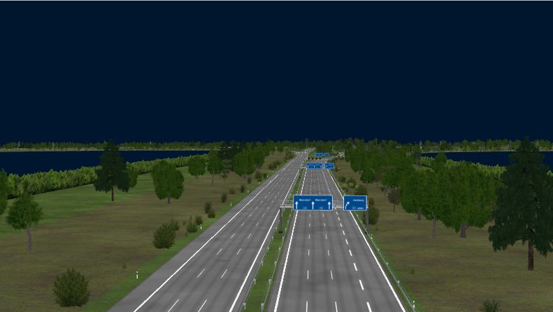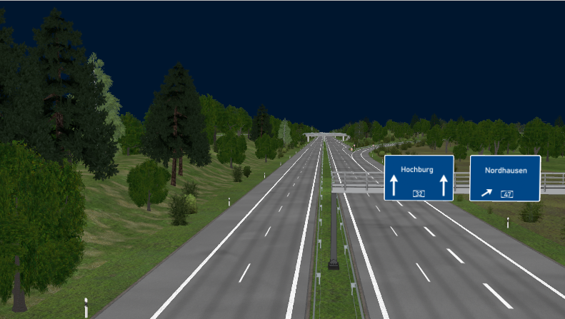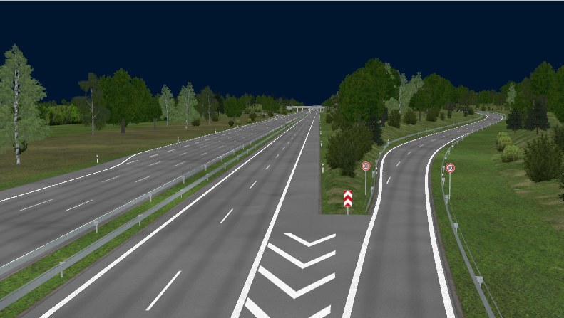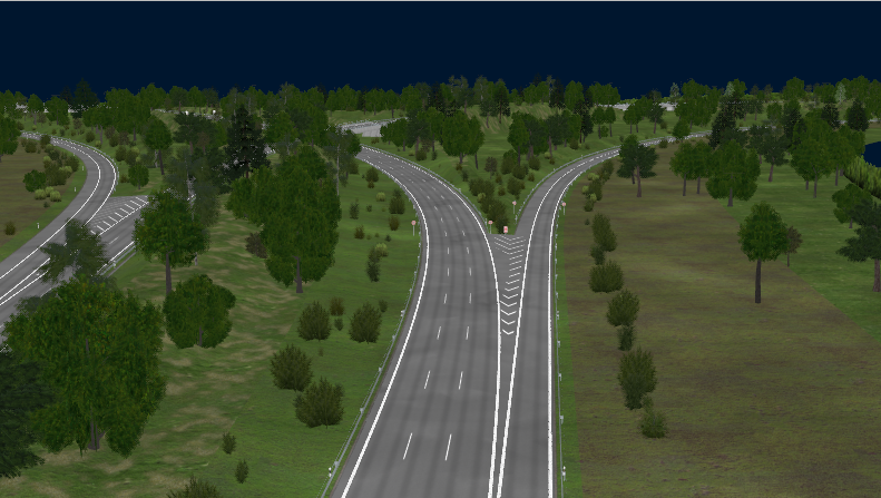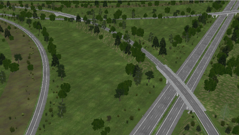 Directional T-Interchange with 3 bridges, using large-radius curves and high-speed ramps, RQ-36, superelevation